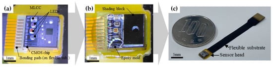 An outline of the sensor assembly is illustrated in Figure 4. The CMOS chip was mounted on a flexible substrate using wire bonding pads. Three LEDs, a 0.1 μF MLCC, and the shading block were bonded on the CMOS chip by using Ag conductive paste (Panasonic, DBC-183SG). The sensor was baked at 150 °C for 10 min on a hotplate to cure the Ag paste. Three LEDs with different emission wavelengths, 660 nm (Epister, ES-SABRPN14D), 810 nm (KLV, EOLC-810-25), and 940 nm (Epistar, ES-SAUFPN14), were chosen for the fabrication, and they differed in their absorbance characteristics with respect to blood and dependence on oxygen saturation []. Electrical connections from the CMOS chip to the flexible substrate-bonding pads and topside electrode pads of the LEDs were achieved using wire bonding. The LEDs and wiring were encapsulated using a potting clear epoxy resin (Inabata & Co., Ltd., Osaka, Japan, IK-0010) and curing at 150 °C for 4 h.