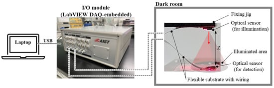 Optical sensing has several advantages owing to its non-invasiveness and high sensitivity []. However, optical sensors tend to be relatively large because they are composed of various optical components, such as a light source, lenses, optical fibers, filters, and detectors. The miniaturization of optical sensors will free them from spatial and weight constraints and enable them to be portable, wearable, embeddable, and implantable [,,,,], thereby expanding their range of applications [,,,]. The scope of the term miniaturization ranges from desktop size to hand size to grain size. Reflective optical sensors, which consist of a light-emitting source, such as a light-emitting diode (LED), and a light-receiving part, such as a photodiode (PD), have a relatively simple component configuration and are particularly advantageous for grain-size miniaturization. An example of a fully integrated reflective optical sensor is the sensor module for the saturation of percutaneous oxygen (SpO2), ADPD144RI (Analog Devices, Inc.) [], which is highly integrated with amplifiers, drivers, and communication interfaces in addition to optical elements. However, application-specific integrated circuits (ASICs) generally have high development costs, and it is difficult to change their specifications, such as making them thinner or changing the photosensitive area. Another example of a reflective optical sensor module, NJR5510R (Nisshinbo Microdevices Co., Ltd.) [], has only a light emitter and receiver, and it can be developed at a lower cost than ASICs or complementary metal-oxide semiconductor (CMOS)-based optical sensors. However, the total volume of the system, including the preamplifier, resistors, capacitor, printed circuit board (PCB), and wiring, limits miniaturization because these external electrical components must be prepared near the optical components. Under these restrictions, a compact and thin yet highly prototypical and customizable design is required to extend the benefits of optical measurements over a wider area.