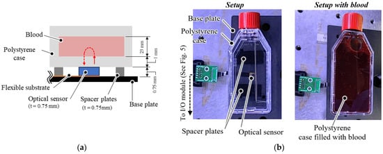 Porcine blood was used as the sample because its optical properties in terms of scattering and absorption are similar to those of human blood []. Porcine blood was obtained during slaughter and was provided by Tokyo Shibaura Organ Co., Ltd. (Tokyo, Japan). Blood samples with adjusted Hct and oxygen saturation (SaO2) were prepared to monitor the blood condition using the sensor. Hct was adjusted to 100%, 75%, and 50% of its initial concentration by diluting with saline (Otsuka Pharmaceutical Co., Ltd. (Tokyo, Japan), Otsuka normal saline). The SaO2 was controlled by supplying pure oxygen gas from a gas cylinder via a membrane oxygenator (Nagayanagi Co., Ltd., (Tokyo, Japan), Nagasep M30-B). Blood samples were placed in a clear-colored case (Merck KGaA, Greiner CELL STAR T-25 flask) made of polystyrene (PS), which has a high and flat transmission rate from 500 to 1600 nm of the wavelength range []. The Hct and SaO2 of the blood samples were measured via centrifugation [] and a blood gas analyzer (Siemens Healthcare K.K., (Tokyo, Japan), Epoc blood analysis system), respectively. An optical measurement setup was constructed to evaluate the performance of the developed sensor (Figure 6). The developed sensor was placed at the bottom of a polystyrene case with a wall thickness of 1.0 mm. Each LED in the developed sensor was turned on sequentially to measure the PD’s light-receiving intensity at each wavelength. In addition, to evaluate the shading effect of the shading block, the PD output was measured without the polystyrene case and blood, and all the LEDs were turned off. The illumination current of the LEDs was adjusted to 3 mA for the 660 nm LED and 10 mA for the 810 nm LED and 940 nm LED. The blood samples were fully stirred via inverted agitation prior to measurement, and Vout was recorded after 30 s of placement on the sensor to ensure that the blood movement was sufficiently stable. Each blood sample was analyzed three times. Vout was normalized to the light intensity Lλ for each wavelength using Equation (1).