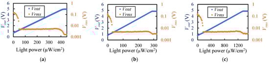 The optical sensor was fabricated using the aforementioned process. The total size of the sensor is 3.8 mm × 4.8 mm in area and 0.75 mm in thickness, including the thickness of the flexible wiring substrate and epoxy mold. The results of the light detection performance are shown in Figure 7. The output voltages at incident light levels of 0 and V0 were 0.73 V. At all wavelengths, Vout increased in proportion to the light intensity, decreasing linearly above 4.6 V and saturating at 5 V. Vrms was large (over 0.1 V) at zero light power, but it decreased as the light intensity increased and stabilized at 5 mV or lower when Vout was 1.2 V or higher. Therefore, the upper and lower limits of measurable intensity at each wavelength were determined from 1.2 V to 4.6 V as the measurable range (Table 1).
