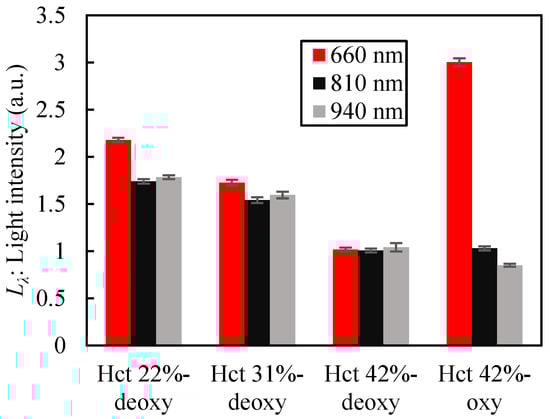 The initial Hct of the blood samples used for the blood assay test was 42%. Dilution with saline resulted in deoxygenated blood samples with Hct values of 42%, 31%, and 22%, and oxygenated blood samples with Hct values of 42%. The corresponding oxygen saturation levels were 69.1%, 66.8%, 64.3%, and 96.2%, respectively. The illumination current of the LEDs was set at 3 mA for the 660 nm LED and 10 mA for the 810 nm LED and 940 nm LED. The results of the optical measurements are shown in Figure 8. The PD outputs were normalized to each wavelength using the PD output at 42% Hct in deoxygenated blood using Equation (1). Each value and error bar shows the average and standard deviation of the three measurements. The intensity of each wavelength when varying from 22% to 42% of Hct decreased with increasing Hct. Sakota et al. reported a large decrease in Hct level (from 12 to 4 g/dL in hemoglobin concentration) due to thrombus formation []. Because hemoglobin is present in red blood cells, the hemoglobin concentration in the blood is proportional to Hct, indicating that the Hct of a thrombus can be as low as 1/3 of the Hct of the blood. Thus, this change in the optical intensity can be applied to thrombus detection. Comparing the intensity at each wavelength in the oxygenated and deoxygenated blood of 42% Hct, the intensity at 660 nm increased 3.0 times, whereas slight changes occurred at 810 nm and 940 nm (1.03 and 0.86 times, respectively). This result is consistent with the trends of the absorbance of oxygenated and deoxygenated blood depicted in [], indicating changes in the optical properties of the blood. The change in the PD output when the LED was turned on and off without placing any object on the sensor was less than 0.2% of the blood sample measurement output at all wavelengths. Therefore, there was no stray light inside the sensor, and the results indicated that the shading block provided sufficient light shielding.