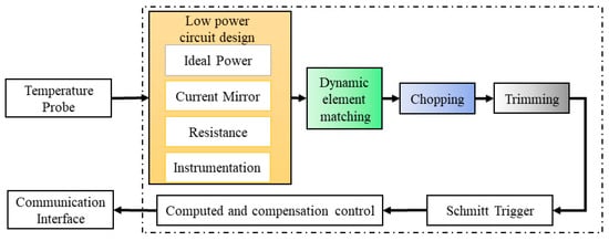 In CMOS chip circuits, the straightforward implantation of MOSFETs (metal oxide semiconductor field-effect transistors) results in poor accuracy. Fortunately, this fault can be solved by applying DEM (dynamic element matching), chopping, and trimming, among other approaches. (Figure 1) [20]. After a single temperature trim, the sensor’s accuracy can be as high as ±0.1 °C (with a range of −10 to 65 °C). These parameters are adjusted within each chip through a technology that mitigates circuit imperfections and offers universal applicability. This method relies on an array of sensors for testing. The amplifier, recurrent in the signal conditioning circuit, is used multiple times. Analog-to-digital conversion is integrated into the chip, producing a digital signal. Ultimately, the individual calibration of each chip is essential for enhanced factory accuracy and sensor precision. The specifications concerning the calibrated CMOS chip are detailed in Table 1.