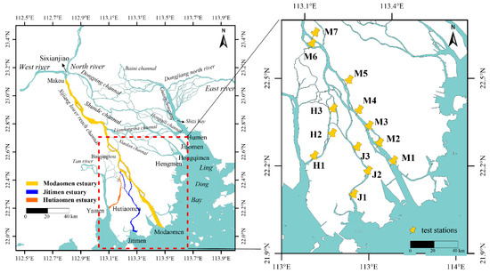 Locations of TS-V1 sensors deployed in the Xijiang Estuary located in the Pearl River Delta. LocationsM1~M7 were deployed in the Modaomen Estuary (MDM), J1~J3 were deployed in the Jitimen Estuary (JTM), and H1~H3 were deployed in the Hutiaomen Estuary (HTM).