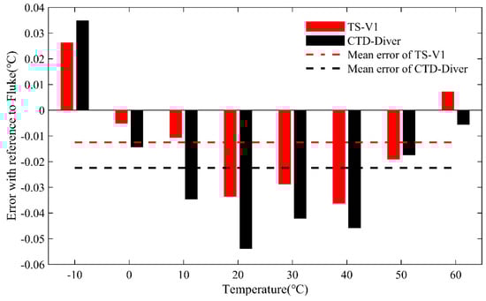 The averaged deviation between the TS-V1 device and the Fluke-1551A reference values across a temperature range of −10 to 60 °C is approximately −0.012 °C, whereas for the CTD-Diver device, it is approximately 0.022 °C. These results suggest that the temperature accuracy of the TS-V1 sensor is acceptable, and it can be used for precise temperature monitoring purposes.