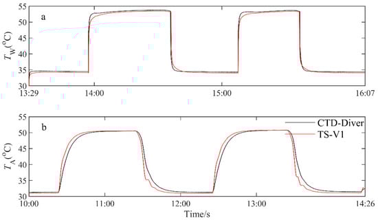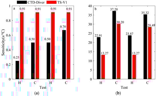 Moreover, we have also shown that the sensitivity deviations among the CTD-Diver samples were approximately 0.08 °C (first heating test), 0.33 °C (first cooling test), 0 °C (second heating test), and 3.85 °C (second cooling test). On the other hand, for the TS-V1 samples, the sensitivity errors were approximately 0.08 °C, 2.74 °C, 0.08 °C, and 0.83 °C, respectively. Notably, the air temperature sensitivity experiment revealed a minimal difference (almost 0) in sensitivity between the two instruments.