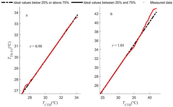 The temperature readings acquired by TS-V1 were compared with those of the commercially available CTD-Diver sensor. We utilized the quantile-on-quantile (QQ) regression method to illustrate the stability of the TS-V1 sensor. In Figure 9, the plus (‘+’) symbols represent measured data points. They feature a solid black line that connects the first quartile (25th percentile) and the third quartile (75th percentile). This drawn line graphically portrays the ordering of the temperature data throughout the observation period, emphasizing the temperature spectrum that covers the 25th to 75th percentiles. Meanwhile, temperature data falling below the 25th percentile or exceeding the 75th percentile are displayed using a black dashed line. Generally, these drawn and dashed black lines visually display the theoretical temperature distribution of TS-V1, suggesting coherence between the observations derived from the CTD-Diver and TS-V1 devices. The QQ plot demonstrates that there is a strong correlation between the observations obtained by TS-V1 and CTD-Diver, with linear coefficients of determination r of 0.98 and 1.01 being observed for water and air temperatures, respectively (Figure 9).