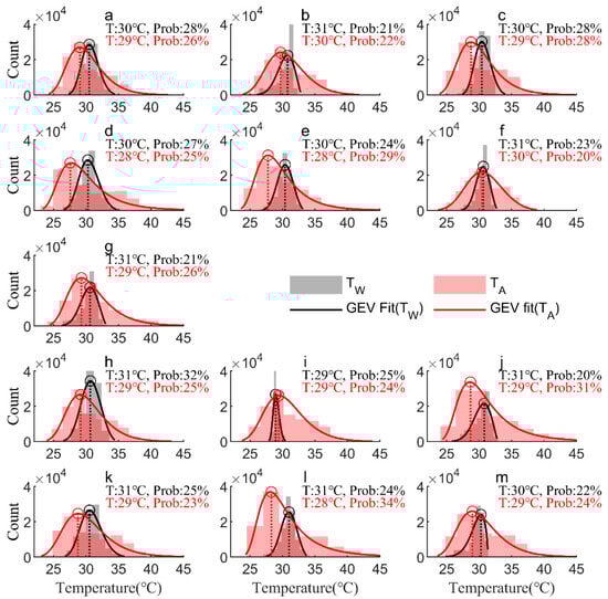 The probability density functions (PDFs) of the GEV distribution corresponding to the observed water temperature (TW) and air temperature (TA) values at 13 stations: (a–g) M1~M7 in the MDM; (h–j) J1~J3 in the JTM; (k–m) H1~H3 in the HTM (here, the black and red circles on the diagram indicate the highest probability temperatures during the study period, with corresponding water and air temperatures provided separately).