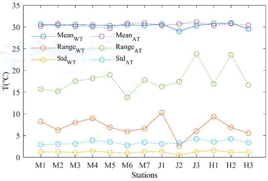 Figure 11 shows a comparison of the mean, range, and standard deviation values of temperatures across deployment sites (M1-M7) in the MDM, (J1–J3) JTM, and (H1–H3) HTM estuaries using the TS-V1 temperature sensor. The results show that the mean water temperature (30.35 °C) for each station closely approximates the corresponding air temperature (30.5 °C). The range curves of the water and air temperatures’ spatial variations in the MDM estuary show a similar pattern at the mouth, although the JTM and HTM estuaries demonstrate a significant contrast. Specifically, within the Xijiang Estuary’s channel networks, the JTM station displays the smallest (J2) and largest (J1) disparities between the water temperature and air temperature ranges. The minimum temperature difference recorded at this estuary was 5.96 °C, while the maximum anomaly was 17.8 °C. The MDM had the smallest standard deviation in air temperature, followed by the JTM with a slightly larger deviation, while the HTM had the largest deviation. Similarly, for water temperature, the JTM had the smallest deviation, the MDM had a slightly larger deviation, and the HTM exhibited the largest deviation. Furthermore, the range and standard deviation of the water temperatures were lower compared to the air temperatures, being 10.79 °C and 2.24 °C, respectively, implying greater stability in terms of water temperature fluctuations. Such phenomona are intricate, and continuous and long-term observations are essential for a comprehensive understanding of the complex thermal dynamics in estuarine and coastal areas.
