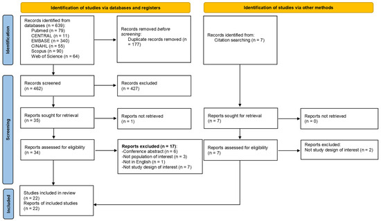 After removing duplicates, 462 records were screened for title and abstract, of which 427 were discarded. We retrieved 34 full texts from the remaining eligible articles, assessed them, and discarded those that did not meet the inclusion criteria. Finally, 17 texts were included, and 5 publications were identified via the relevant systematic reviews. Figure 1 illustrates the flow diagram of study selection.