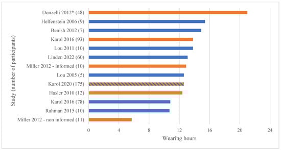 The weighted average number of hours recorded by the sensor in the five studies that reported such values (with standard deviations) was 12.4 ± 5.4 [17,18,21,24,33]. We calculated a weighted average of 13.1 h from 12 studies, adding 2 studies that did not report the standard deviation [16,22] and 5 studies that had information that allowed us to calculate the average wearing hours. Finally, one study reported subgroup’s information but not their population and, thus, could not be included in the weighted averages [34]. The data among subgroups ranged between 5.7 and 21 h per day (Figure 2).