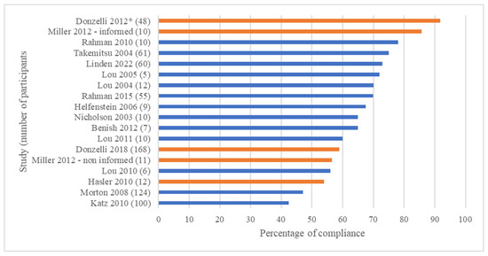 Following the same methods, we found an average recorded compliance of 70.4% ± 25.9% from 12 studies [18,20,21,24,26,27,28,29,31,32,33,34], as well as 61.2% when including studies without standard deviation [16,19,23,25,30]. The range among subgroups was between 21.8 and 93.9% (Figure 3).