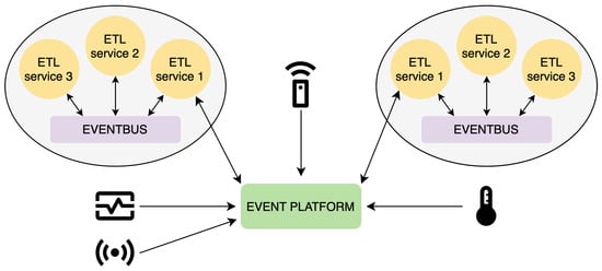 Furthermore, combining ZMQ and MQTT communication technologies enables efficient data transfer and processing even in high-volume or limited networked scenarios. The lightweight nature of MQTT makes it well-suited for constrained environments and low-bandwidth networks [], while ZMQ’s asynchronous messaging capabilities provide reliable and high-performance communication between ETL services. Both chosen communication technologies use publish-subscribe architecture, contributing to the system’s modularity. The proposed architecture design with the event bus and event platform can be seen in Figure 3.