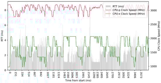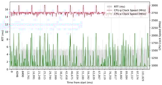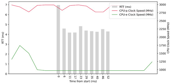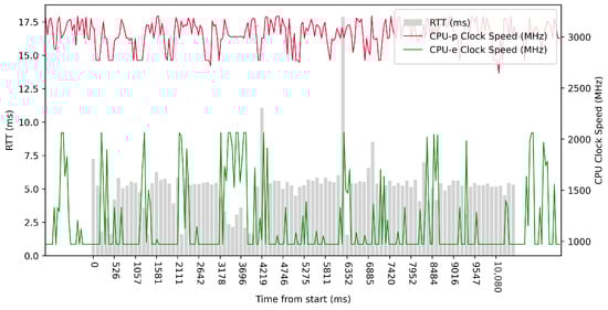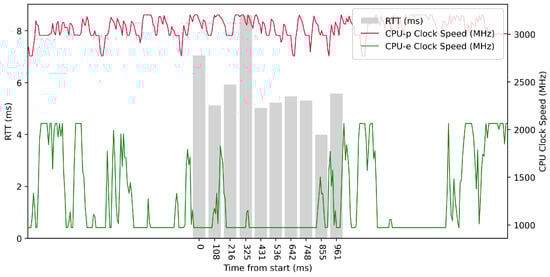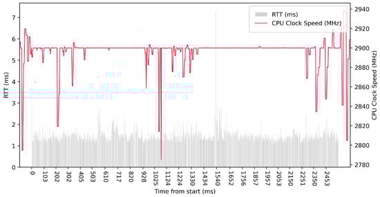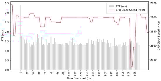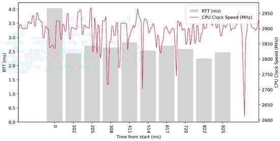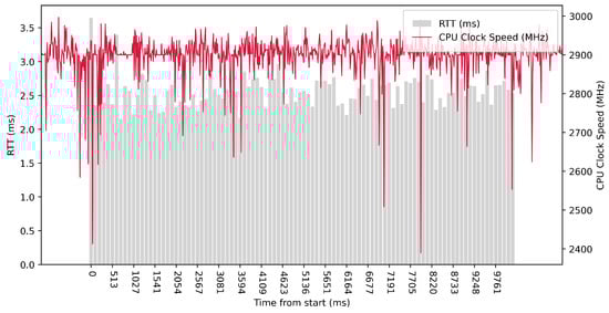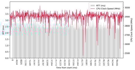 Test No. 9 consisted of 1000 measurements of RTT communication across ETL services with a delay of 1 ms between measurements. The median of this set of measurements was 1.425 ms, and the mean was 1.475 ms, indicating that the distribution of measurements was approximately symmetric. The standard deviation was 0.317 ms, indicating that most measurements were close to the average. Other data can be seen in Table 3. Compared with previous tests, it can be seen that a short delay resulted in the lowest average value of RTT. Comparing tests No. 6 and No. 9, we can observe lower mean and median values in test No. 9. However, in test No. 9, the maximum value of RTT is significantly higher. In the graph in Figure 19, we can see an increase in the clock speed of the CPU cores during the test, which was fairly stable throughout the test.