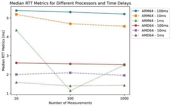 Figure 20 shows a significant difference in performance between the ARM64 and AMD64 processors in our evaluation of the RTT metrics. As the number of measurements increases, the ARM64 processor shows a greater decrease in median RTT than the AMD64 processor. This could be due to the differences in the architecture of the two processors. On the other hand, the AMD64 processor shows consistently low latency across all test scenarios, highlighting its suitability for real-time computing applications that require minimal latency. In addition, the data show that as the time delay between measurements decreases, the median RTT values for both processors tend to decrease, suggesting improved performance with more frequent requests. Overall, these results provide valuable insight into the performance of the two processors in real-time computing applications and can help select the appropriate hardware for specific use cases.