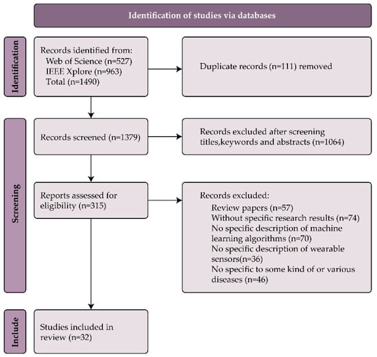 | Web of Science | ((TS = (wearable OR wearable sensor OR wearable device OR wearable sensing device OR accelerometer)) AND TS = (machine learning OR intelligent system OR deep learning OR SVM OR support vector machines OR random forest algorithms OR neural network algorithms OR multilayer perceptron OR artificial neural networks OR ANN)) AND TS = (rehabilitation OR recovery OR rehabilitation training) |