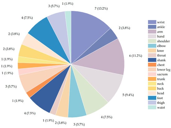 | [53] | Accelerometer/gyroscope/magnetometer (non-invasive) | 20 patients Male: 8 Female: 12 | Shoulder | Time domain features: mean/root mean square/standard deviation, etc. Frequency domain features: maximum frequency component/mean frequency component/energy spectral density, etc. | 100 Hz (accelerometer) 100 Hz (gyroscope) 25 Hz (magnetometer) | Shoulder abduction/shoulder flexion/wall slide/wall press/shoulder rotation | Musculoskeletal disorders | Using a single inertial sensor and supervised machine learning technology to identify and classify shoulder rehabilitation activities |