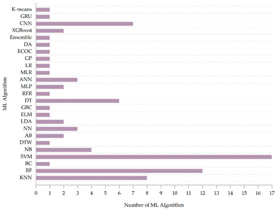 | [54] | DT/RF/SVM/LDA/MLP | 76.6% (DT) 91.8% (RF) 71.8% (SVM) 80.6% (LDA) 82.6% (MLP) | The performance of the classifier was tested by leave-one cross-validation. Each classifier was tested under four different conditions to determine an optimal classifier. | Due to the limited sample size, it is not guaranteed to perform well on larger datasets. |