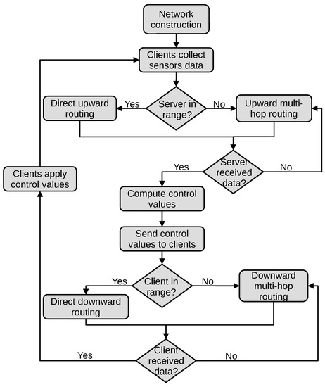 In order to ensure optimal cultivation conditions, various microcontrollers equipped with sensors, actuators, and wireless communication modules are deployed in the indoor farming facility to monitor and control the system according to the user’s requirements. The indoor farming facility is supposed to be divided into several compartments representing growth chambers and containing different plant species or plants at different growth stages. This means that each growth chamber requires particular environmental conditions and management procedures. The microcontrollers are organized in equidistant positions in a grid topology because the growth chambers are also supposed to be positioned next to each other in a plant factory. On the other hand, a control room is positioned on the side of the growth chambers where another microcontroller, a computer, or a server with the necessary computational power is used for the remote monitoring of the growth conditions. The communication between the microcontrollers is based on the IPv6 protocol, and the range of each microcontroller, including the server, only reaches the neighboring microcontrollers. Multi-hop communication is established to transfer the data between devices out of range. The RPL (routing protocol for low-power and lossy networks) routing protocol works effectively in networks composed of constrained IoT devices used for data collection, generally called WSN (wireless sensor network). Overall, two types of devices exist in the proposed network: a master device and slave devices, also called server and clients. The master device is the root node of the network responsible for processing the data received from other nodes, whereas the slave devices are source nodes that can play two roles: sensing information and forwarding it periodically to the next nodes until reaching the root node, receiving control information from the root and forwarding it to the corresponding sensor node, or applying this information in the growth chamber. Figure 2 illustrates the proposed remote grow light control architecture for indoor farming, and Figure 3 shows the flowchart of the process.