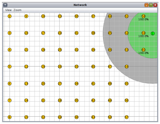 The proposed 6loWPAN network consists of 10 to 60 nodes in which client nodes are distributed in a grid topology with equal distances between the nodes in each direction, whereas the root of the network is located on the side of the grid. Figure 4 shows the nodes’ positions as they are supposed to be in the indoor farming facility. The server node is the first node in the network (green color), and the remaining nodes (yellow color) are the clients. Each client node is responsible for controlling the growth conditions—more specifically lighting—in a growth chamber, so the number of nodes represents the number of the growth chambers, and the size of the indoor farming facility can be estimated based on it.