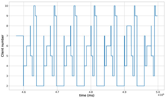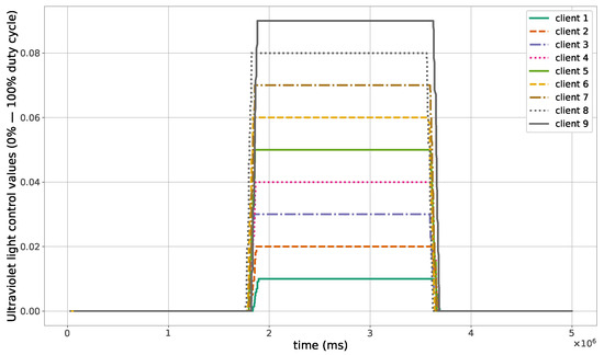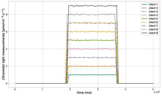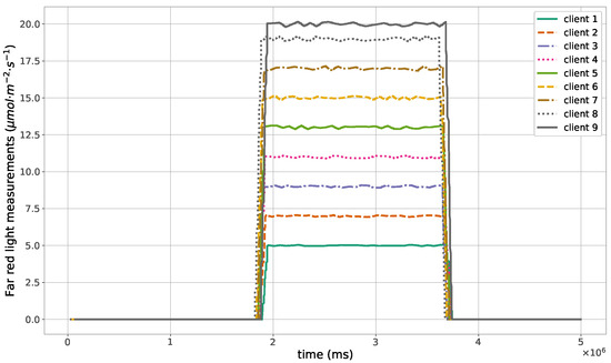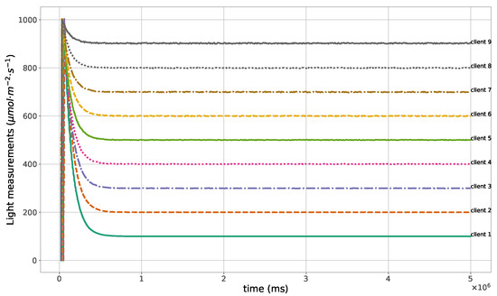 The proposed method for the remote distributed control of grow lights was programmed in C language and implemented in the root node. Three different types of LED lights were considered in each growth chamber: PAR lights with intensity ranging from 100 to 900 mol · m·, far-red lights with intensity ranging from 5 to 20 mol · m·, and UV lights with intensity ranging from 1 to 9 mol · m·. This range of different values was used to test the control method; they are not exact values, but they are within the range of values needed by some plants grown in indoor environments. The maximum illuminance produced by these LED lights is supposed to be equal to 1000 mol · m·. The network was then simulated under the previously mentioned conditions, and the obtained results in the case of 10 nodes are given in Figure 5, Figure 6, Figure 7, Figure 8, Figure 9, Figure 10 and Figure 11. Figure 5 is produced by the server, and it shows the PAR light intensities measured by the sensors connected to the clients in the 9 growth chambers of the indoor farming facility. The measurements are noisy, and it can be noticed that they rapidly converge to the desired values. The control values sent from the server to the clients to obtain the previous measurements are given by Figure 6; notice that these values are not affected by sensor noises. Similarly, Figure 7 and Figure 9 are produced by the server, and they show the far-red and UV light intensities measured by the clients in the 9 growth chambers, respectively. It can be noticed that the control method also works for these types of temporary and low intensity light treatments. The light intensities converge to the desired values, and despite the fact that the treatments do not start at the same time in all the growth chambers, they all have the same duration as fixed from the server, which is the most important for plants. These different starting times of the light treatments are negligible (in milliseconds) and depend on the routes chosen by the routing protocol based on the selected OF, the topology of the nodes, data scheduling, and the performance of the network. The control values of far-red and UV lights sent from the server to the clients that led to one obtaining these measurements are given in Figure 8 and Figure 10, respectively. It is worth mentioning that, due to data loss that can occur during communication, some values are missing and are replaced by interpolation so that the previous figures can be obtained from the recipient side. Figure 11 shows the communication sequence between the clients and the server during this light control process; this can change depending on the topology of the nodes, the scheduling algorithm, and the route chosen by the routing protocol depending on the used OF. This figure can give us an intuition about why the far-red and UV light treatments do not start at the same time in all the growth chambers.