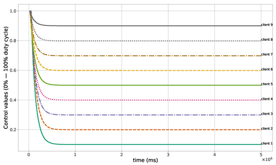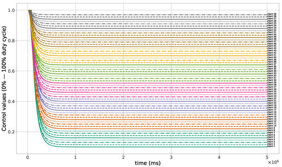 A high packet loss ratio and delay can occur in the case of large size networks; see, for instance, the 60 nodes case in Figure 12 and Figure 13. To see if this affects the control method and changes the light conditions in the growth chambers, another simulation with 60 nodes was performed. The obtained light measurements that were sent from the clients and received by the server are shown in Figure 14, while the control values sent from the server to the clients are plotted in Figure 15. Notice that the control process was not affected in this case, and all the measured light intensities converge to the desired values.
