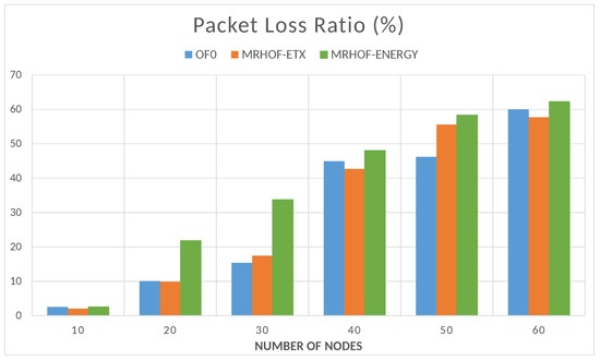 the obtained results are shown in Figure 12, where it can be seen that the packet loss ratio increases with the network size. This graph shows that there is no big difference between the three RPL OFs, but the MRHOF-energy OF shows the highest packet loss ratio because it basically chooses the forwarding nodes based on their energy consumption and not based on the success of packet transmission like the MRHOF-ETX.