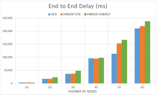 where is the packet receiving time of the node i and is its packet sending time. Similarly, the time of packet delivery also increases with the network size; this is because the packets pass through a higher number of forwarding nodes before reaching their destination as shown in Figure 13. The objective function OF0 performs better in this case since it is designed to choose the shortest path to the destination, which reduces the number of forwarding nodes for the packets.