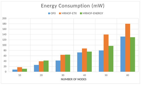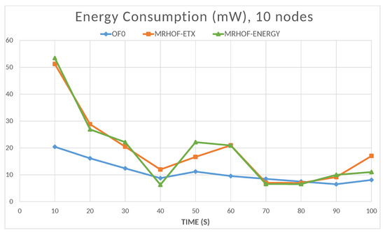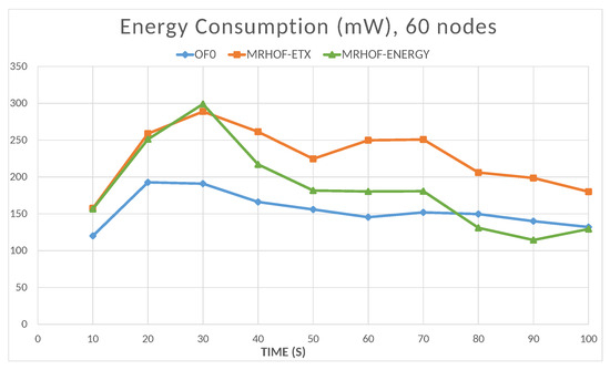 The energy is computed by the Energest tool (Powertrace in Contiki); the resulting energy consumption value is the sum of the amounts consumed by the microcontroller in the CPU processing mode, CPU low-power mode, data transmission mode, and data listening mode. The total energy consumption of the network naturally increases with the number of nodes, as shown in Figure 16. In this case, the objective functions OF0 and MRHOF-energy perform better than MRHOF-ETX. The reasons for this are that the MRHOF-ETX calculation method is computationally more expensive than the other OFs and may consume more energy; also, the routes chosen by the MRHOF-ETX are not necessarily the shortest ones but the ones that ensure the packet delivery. Figure 17 and Figure 18 show the evolution of the energy consumption over time for the 10 and 60 nodes cases, respectively. It can be seen that the energy consumption stabilizes after a certain time when the network configuration is finished, the routes are established, and the computation time spent on the routing process decreases. For small networks (Figure 17), all the OFs give the same performance after network stabilization, in terms of energy consumption, while the difference between them appears in large networks (Figure 18), where the previous observation on the high energy consumption of MRHOF-ETX is confirmed.