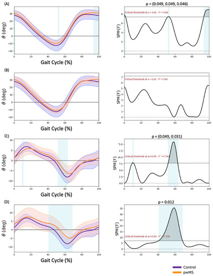 Based on our knowledge, there are no studies using SPM to analyze the kinematics of pwMS with mild disability (≤3 EDSS). Therefore, the aim of this study was to compare the lower-limb joint kinematics during gait between pwMS with ≤3 EDSS and healthy subjects using SPM.