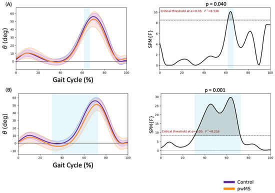 Movement analysis plays a crucial role in the assessment of motor impairments associated with MS, as well as in understanding the functional limitations experienced by these individuals. In addition, movement analysis is useful in the development of personalized rehabilitation programs that address the specific movement deficits of each person and also in monitoring the evolution of the disease. Movement analysis in people with MS involves a comprehensive assessment of their gait, balance and coordination. Researchers use sophisticated technologies, such as motion capture systems, force plates and wearable sensors, to capture and quantify various movement parameters, comparing representative points, such as the degrees of hip extension at foot-off. However, statistical parametric mapping (SPM), originally developed to analyze cerebral blood flow, has begun to be used in biomechanics to compare the entire joint kinematic curve between two or more groups of subjects [14,15,16]. In a previous study, changes were observed in pwMS in the ankle, knee and hip joints compared with healthy controls. However, that study analyzed people with different forms of MS and moderate disability (a mean of 5.5 points on the Expanded Disability Status Scale (EDSS)) [17].