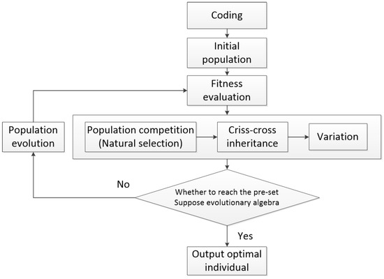 The classical genetic algorithm consists of three basic operations: selection, inheritance, and mutation. It combines individual “heredity and mutation” with nature’s “survival of the fittest” to find the optimal individual. The specific process is shown in the Figure 3.