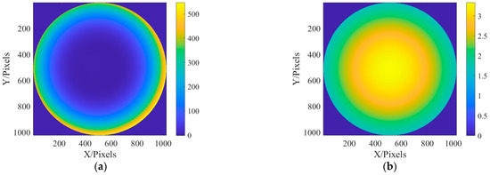 Due to the parallel incident light in this paper, there is only on-axis aberration in principle, but there are also some off-axis aberrations in the paraxial field of view. Therefore, in the simulation, the aberrations on the defocus and spherical aberrations are larger, and the other off-axis aberrations are slightly smaller. The values of the six Zernike coefficients were, respectively, 0.9, 0.2, 0.2, 0.5, 0.5, and 1.0. Exit pupil plane wave aberration fitted with the above six coefficients . In addition, due to the use of a laser monochromatic light source, the amplitude of the light source is simulated with Gauss amplitude. The fitted phase difference distribution at the exit pupil and laser amplitude distribution are shown in Figure 4.