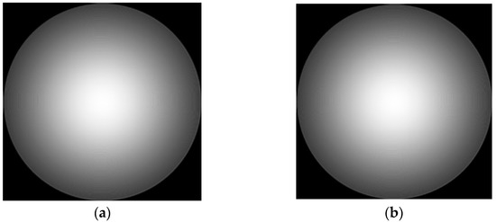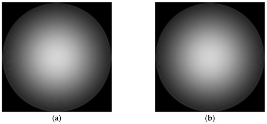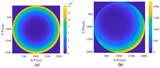 After obtaining the phase distribution of the Gaussian image, the exit pupil aberration should be solved so that the aberration filter can be constructed to correct the Gauss image. According to the aberration correction model in this paper, the optical intensity distribution of the focal plane and the defocusing plane should be collected. In this process, optical path parameters should be strictly consistent with the Gauss image acquisition optical path, and only the resolution plate should be removed so that the imaging system can directly image the interferometer optical source. In this paper, the defocusing distance is 0.1 mm, and the optical intensity distribution of the obtained focal plane and the defocusing plane is shown in Figure 27.