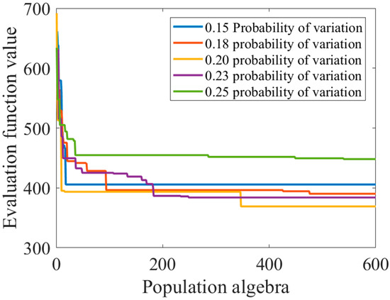 The essence of prematurity is that the individuals in the group are homogenized seriously so that the high-order competition mode cannot be formed. The mutation stage can produce new individuals through gene mutation, increase the diversity of the population, have a certain probability of producing better individuals, and, to a certain extent, can inhibit the phenomenon of precocity puberty. In this section, multiple mutation probabilities are used to solve the problem. The solution results and population iteration process are as follows: