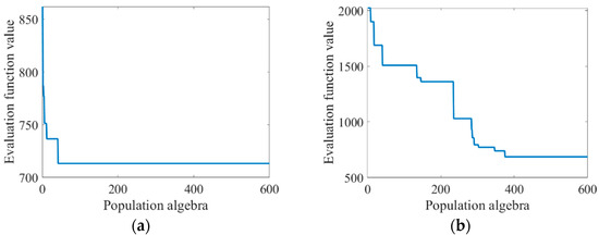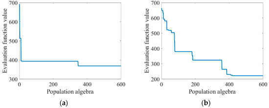 Graph of changes in evaluation function values as the population algebra increases: (a) before algorithm improvement; and (b) improved algorithm.