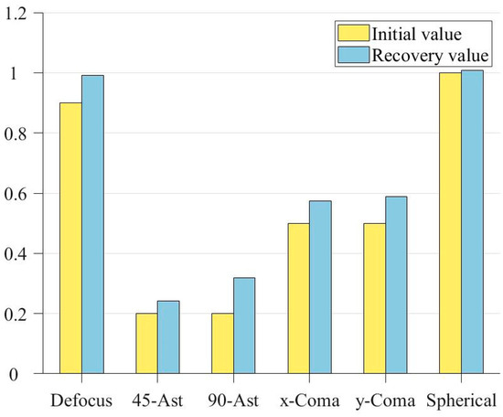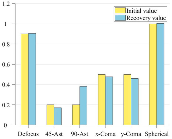 In order to more intuitively show the recovery of the exit pupil phase by the improved genetic algorithm, a bar chart of coefficient comparison is drawn according to Table 3, as shown in Figure 9: