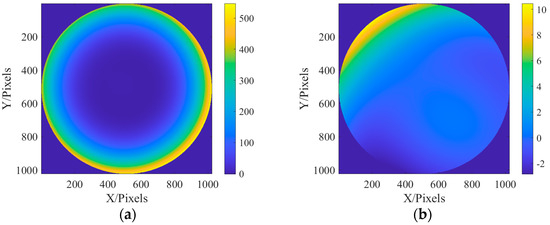 Aberration distribution and residual distribution of the recovered exit pupil: (a) recovered exit pupil aberration distribution; and (b) residual distribution.