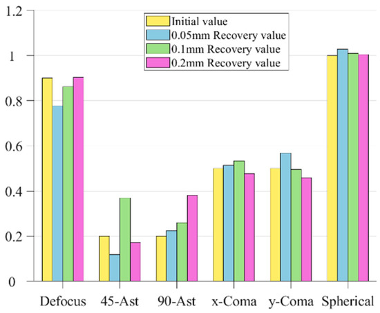 According to the solving principle of aberration in the exit pupil frequency domain in Section 2, the phase recovery algorithm mainly depends on the mutual iteration between the focal plane and a subsequent defocusing plane, so the defocusing distance will have a certain influence on the precision of phase recovery. Here, a simulation study is made on the influence of defocusing distance on the solving accuracy. In this section, the defocus values of 0.05 mm, 0.1 mm, 0.2 mm, 0.3 mm, 0.5 mm, and 1.0 mm were, respectively, selected for simulation using genetic algorithm. The recovery results of each Zernike coefficient were shown in Table 5. The changes in evaluation function values along with the defocus distance were shown in Figure 12: