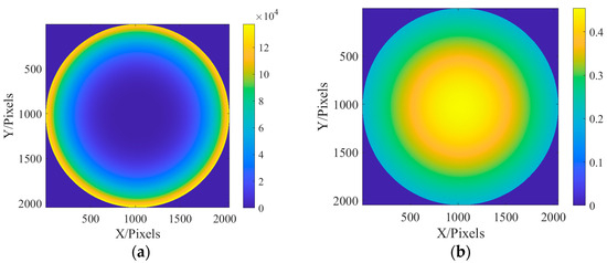 In this section, the classic Cameraman image is used for imaging. Since the pixel of Cameraman’s image is 512 × 512, it needs to be expanded to 2048 × 2048 pixels. In the simulation, the distribution of aberration at the exit pupil is still fitted by the Zernike polynomial, and six aberrations such as defocus (Z1), astigmatism (Z2, Z3) (45° and 0/90°), aberration (Z4, Z5) (x, y directions), and primary spherical aberration (Z6), are fitted. The coefficients of the Zernike polynomial are, respectively, 0.9, 0.2, 0.2, 0.5, 0.5, and 1.0. The fitted phase difference distribution at the exit pupil and amplitude distribution of the light source are shown in Figure 15: