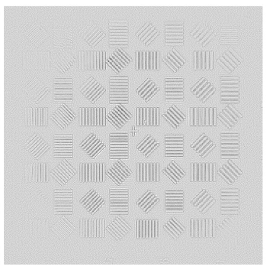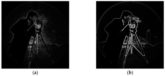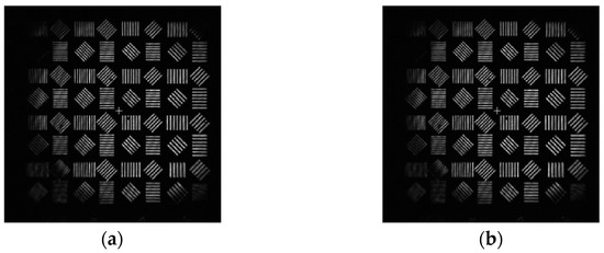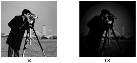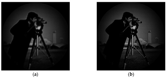 The phase distribution of the aberration in the frequency domain at the exit pupil of the system is known as , and the aberration correction filter of the system can be obtained by conjugate processing according to the aberration correction model in this paper. As can be seen from Equations (2)–(5), the filter can be used to directly correct the aberration of the system image in the frequency domain. Cameraman’s images before and after aberration correction are shown in Figure 20: