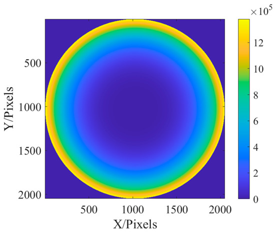 The light source is a 632.8 nm monochromatic light source from the Zygo interferometer. The focal length of the optical system used is 149.98 mm and the exit pupil size is 32.22 mm. A panchromatic CCD image sensor with a pixel size of and resolution of is placed behind the optical system. In this paper, sampling points are intercepted in the phase recovery algorithm. The collected Gaussian image is shown in Figure 25: