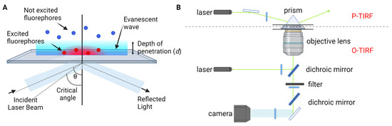 TIRF microscopy for single-molecule fluorescence imaging. (A) Principle of TIRF microscopy. (B) Types of TIRF microscopy: prism-type (P-TIRF) or objective-type (O-TIRF).