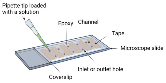 Schematic representation of an imaging device. The construction of an imaging device entails the integration of a microscope slide and a coverslip, employing double-sided tape for precision juxtaposition, followed by hermetic sealing with epoxy resin. The holes on the slide are used as the inlet and outlet for solution exchange.