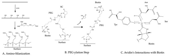 Typically, surface-immobilized avidin, streptavidin, or neutravidin (from here on avidin will be used interchangeably with any of these forms of avidin) tether biotinylated biomolecules to the imaging region. To immobilize avidin on the surface, biotins are introduced onto the surface before or during the passivation step. For the PEG passivation method, a percentage of the PEG molecules that passivate the surface contain a biotin moiety on the opposite end from the ester group [43]. The ester group in the biotinylated PEG molecule reacts with the amine group on the surface as shown in Figure 3B. For the Tween-20 passivation method, researchers introduce biotinylated BSA to the imaging device prior to passivation. The biotinylated BSA adheres to the hydrophobic surface before Tween-20 passivates the surface [42]. For the lipid passivation method, either a fraction of the lipids will be biotinylated [46] or avidin will be directly applied to the imaging surface before passivation [47]. Avidin binds to biotin molecules with high affinity (KD~10−15 M) [48]. This affinity comes from a number of hydrogen bonds formed between the amino acids of avidin’s biotin-binding site and the biotin molecule as diagramed in Figure 3C. Since avidin forms a tetramer, avidin molecules bound to the biotins on the imaging surface still contain available biotin binding sites to immobilize biotinylated molecules.