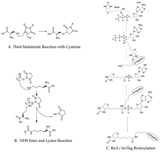 Chemical diagrams of common protein labeling strategies. (A) Thiol–maleimide reaction represents a common way to label cysteine residues in proteins. (B) NHS ester reaction with lysine provides a way to label proteins. (C) The process of AviTag biotinylation as a way to tether proteins to immobilized avidin.