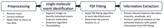 To achieve high spatial resolution, it is essential to precisely localize the position of each detected fluorophore. This localization is typically performed using a technique called point spread function (PSF) fitting, where the observed intensity distribution of a fluorophore is fit to a mathematical model of the PSF. By accurately determining the center of the PSF, the position of the fluorophore can be determined with sub-pixel precision, enabling precise localization of single molecules. Sage et al. [29] comprehensively evaluated software packages for single-molecule localization microscopy (SMLM). Many modules from these software packages would be usable for TIRF-based single-molecule fluorescence imaging datasets.