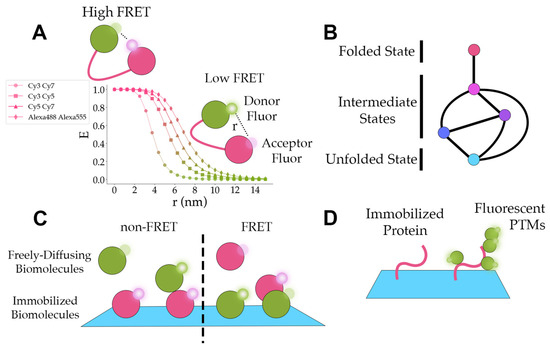 Application concepts. (A) A graph of ideal smFRET efficiencies (E) versus distance between fluorophores (r) for different fluorophore pairs. The Förster radii for Cy3-Cy7, Cy3-Cy5, Cy5-Cy7, and Alexa488-Alexa555 are 3.8 nm, 5.4 nm, 6.2 nm, and 7 nm, respectively [84]. The green and pink colors distinguish between domains labeled with donor and acceptor fluorophores. The small, semi-transparent circles represent fluorophores that are not radiating light. The small circles with white highlights represent fluorophores that are emitting light. (B) A diagram displaying the paths (the lines connecting the circles) between folded, intermediate, and unfolded states (the circles). The different colors illustrate the distinct smFRET efficiency peaks for each state. (C) A representation of freely diffusing fluorescent biomolecules interacting with immobilized fluorescent biomolecules. In the non-FRET case, green and pink colors separate biomolecules with spectrally distinct fluorescent signals. In the FRET case, pink biomolecules contain an acceptor fluor and green biomolecules contain a donor fluor. (D) A diagram of an immobilized protein (pink) and an immobilized protein with fluorescent post-translational modifications (PTMs) (green).