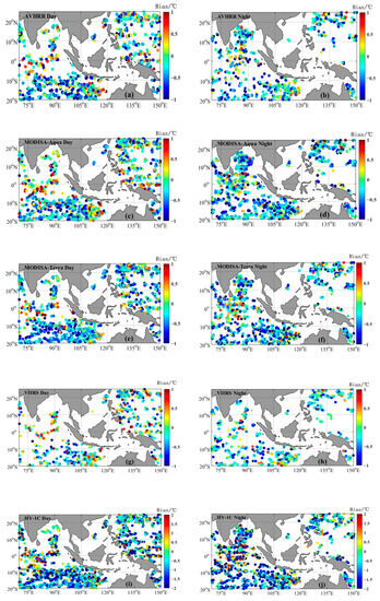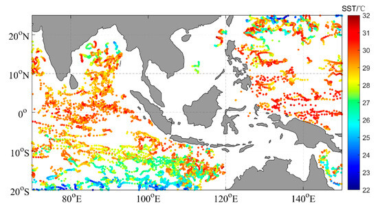 The matched point positions between the infrared SST and buoy-measured data are shown in Figure 2. As shown in Figure 2, the matched points were mainly distributed in the eastern Indian Ocean and western Pacific Ocean, while there were fewer matching points in the surrounding waters of the South China Sea, which was related to the distributions of the Argo buoys. There was an overall negative deviation between the satellite SST and Argo data. The negative deviation values with significant deviation were mostly concentrated between latitudes 20° S and 10° S, while the positive deviation values (red dots) were mainly in the Indian Ocean waters between latitudes 10° S and 10° N.