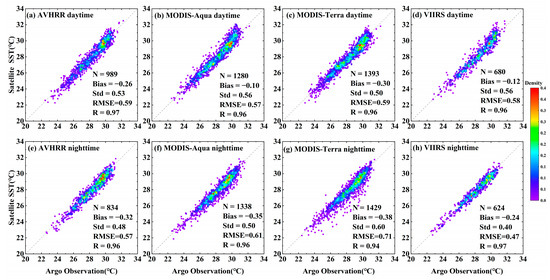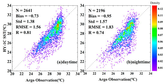 The error statistics between the satellite SST of five infrared radiometers and Argo observations are shown in Table 2. The bias of the five infrared radiometers was negative, and the absolute value of the bias of each radiometer at night was greater than that in the daytime. The bias of the MODIS-Aqua and VIIRS daytime SST data was the smallest, with values of −0.1 °C and −0.12 °C, respectively. Except for the HY-1C COCTS, MODIS-Terra had the highest nighttime Std at 0.6 °C, while the RMSE was also relatively large, reaching 0.71 °C. The scatter plots of the AVHRR, MODIS-Aqua, MODIS-Terra, and VIIRS remote sensing SST and Argo-measured data are shown in Figure 3. From Figure 3, it can be observed that the bias, Std, and RMSE of the MODIS-Terra nighttime SST were greater than those of the daytime data, while the Std and RMSE of the VIIRS nighttime SST were smaller than those of the daytime data. The four satellite SSTs had good correlation with the Argo data in the Southeast Asia seas, with the VIIRS SST data having the best quality. During the daytime, the bias, Std, and RMSE of HY-1C were −0.73 °C, 1.38 °C, and 1.56 °C, respectively. The data quality during the nighttime was lower than that during the daytime, while the bias, Std, and RMSE were −0.95 °C, 1.57 °C, and 1.83 °C, respectively. The scatter plot of the HY-1C SST and Argo-measured data is shown in Figure 4. Overall, the deviation between the HY-1C SST and Argo-measured temperature was significantly larger compared to other satellite SSTs.
