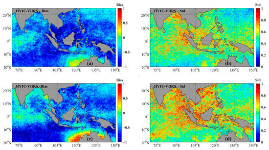 To investigate the seasonal correlation and the differences between the HY-1C SST and VIIRS SST, the bias and Std of the monthly average SST data in Southeast Asian waters were calculated, and the statistical results are shown in Table 3. Table 3 shows that the bias between the HY-1C SST and VIIRS SST was negative. The daytime and nighttime data of the HY-1C SST and VIIRS SST fluctuated between −0.69 °C to −0.37 °C and −0.80 °C to −0.16 °C, respectively, indicating that the COCTS/HY-1C SST was lower than the VIIRS SST and had seasonal characteristics. The cloud detection processing method for the COCTS is not effective enough for some conditions, such as light cloud covering, so some gridded SSTs of the COCTS become lower. A more effective cloud detection method for the COCTS needs to be developed in the future [26].